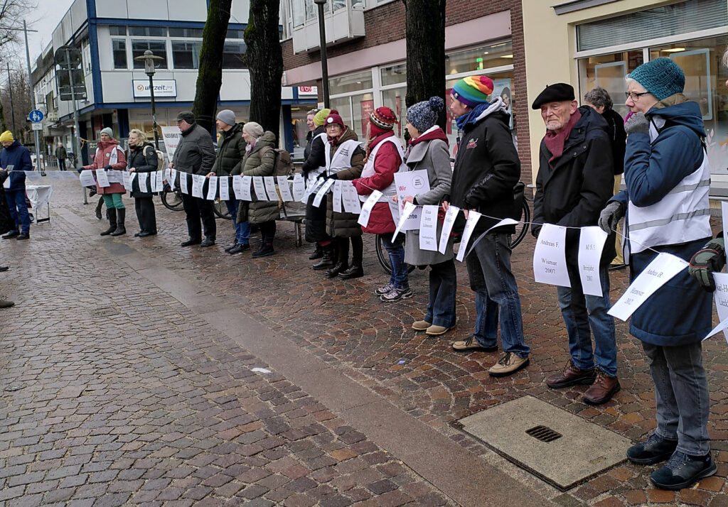 Wir haben am 21. Februar um 12 Uhr auf dem Rondeel der Opfer der Anschläge von Hanau (19.02.2020) und Halle (09.10.2019) gedacht sowie 50 weiterer Personen, die in den vergangenen Jahrzehnten hier in Norddeutschland Opfer von Rassismus und Antisemitismus wurden. Ihre Namen bildeten eine lange Reihe an einer Schnur, die uns veranschaulichte wie viele zumeist unaufgeklärte und ungesühnte Verbrechen in unserer Umgebung begangen wurden. Wir haben sie beim Namen genannt, um sie dem Vergessen zu entreißen und ein Zeichen für Vielfalt, Respekt und Menschlichkeit zu setzen.