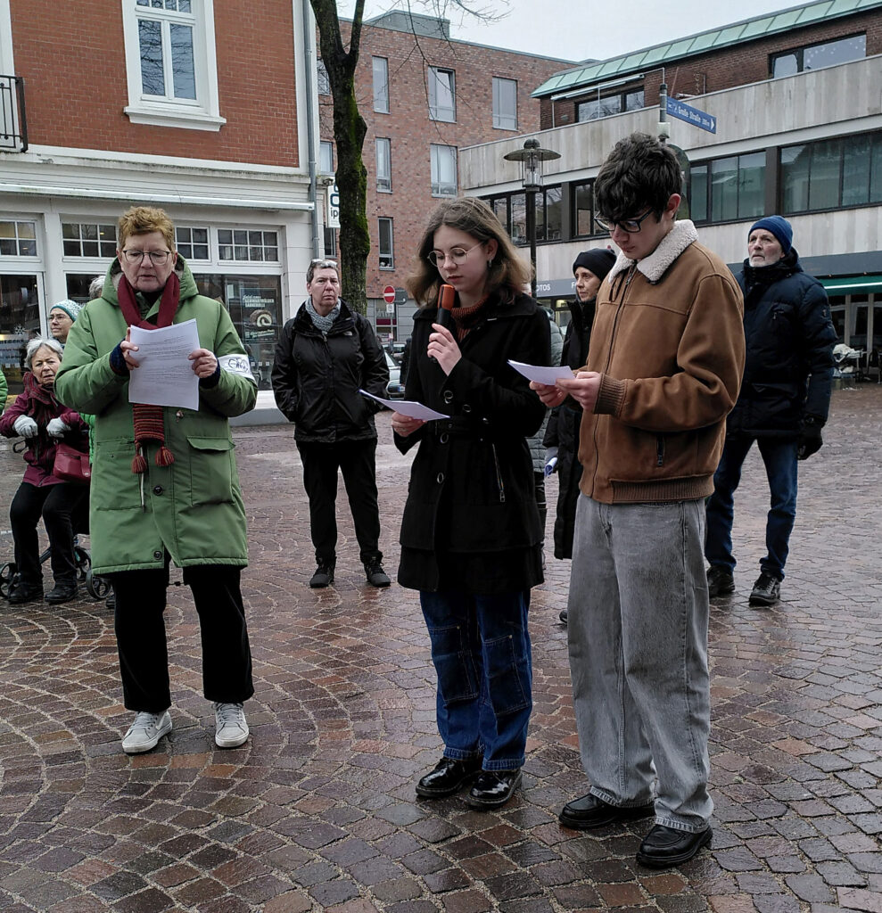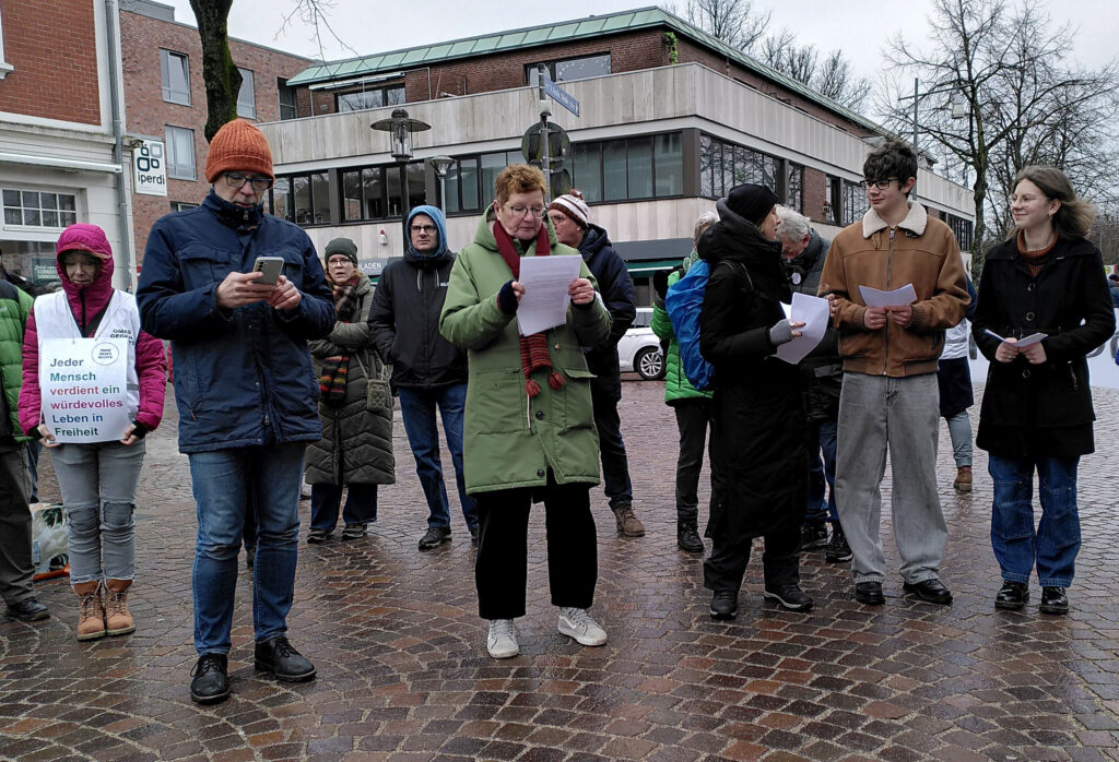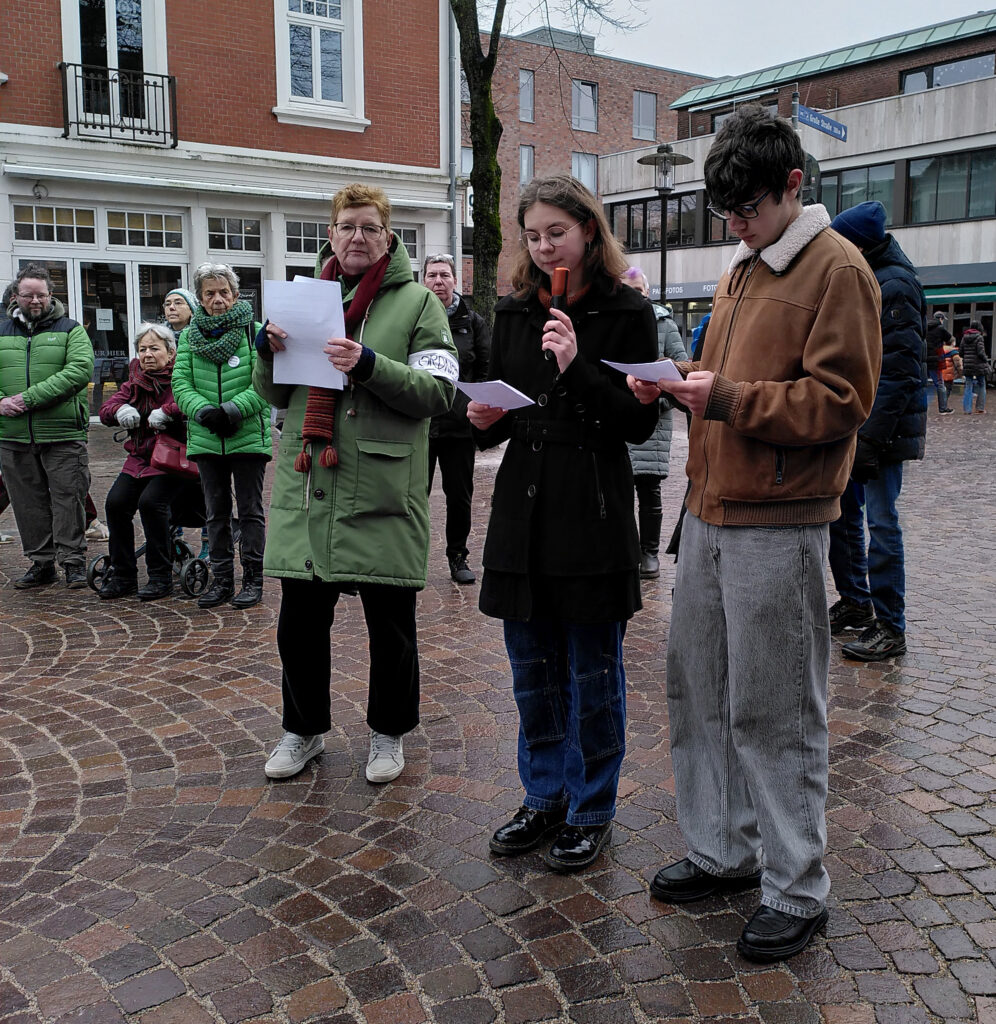 Zwischenkundgebung am Marstall: Hier versammelten sich die Teilnehmenden des Gedenkmarsches, um mehreren Wortbeiträgen zuzuhören. Es wurde von den Erinnerungen der Ahrensburger Zeitzeugen an die Todesmärsche berichtet und im Anschluss erzählten Schülerinnen aus Rahlstedt von der Bedeutung, die das Erinnern für ihr praktisches Verhalten in der Gegenwart hat.
